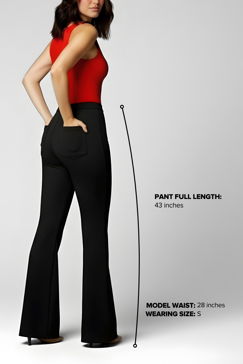 Fitted at the thighs and flared at the bottom, the long 43-inch length gracefully falls over your footwear, creating a flattering silhouette. With two functional back pockets, these multipurpose pants seamlessly pair with casual and corporate outfits, making them the perfect choice for any occasion.