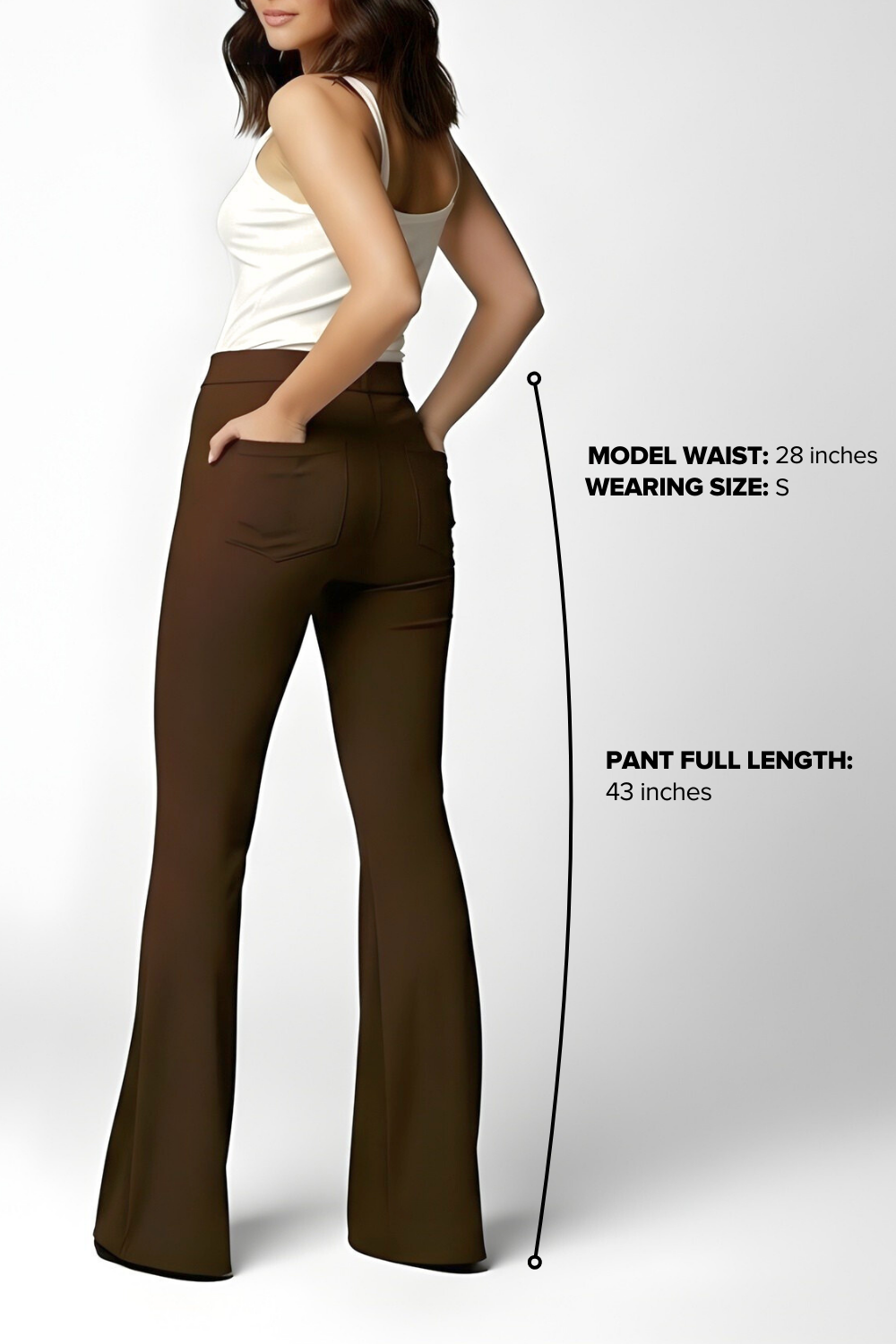Th full length of the pant is 43" inches which is designed to create a sleek, elongated look that gently skims over your shoes or heels without dragging.