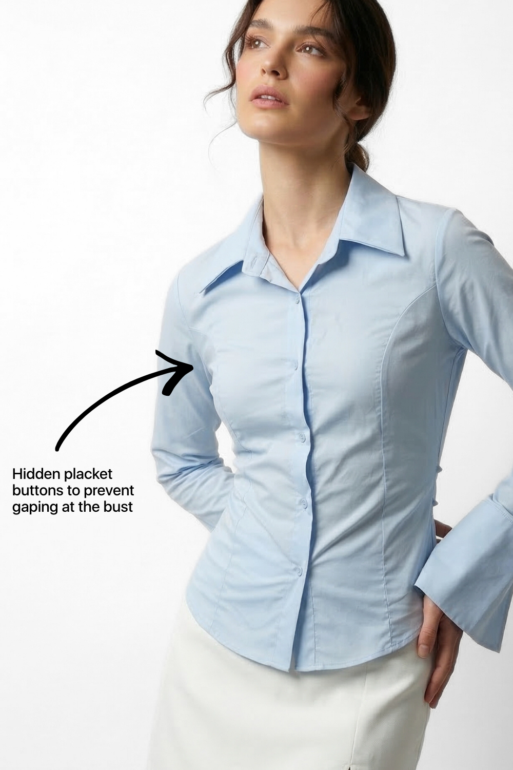 • Detailing: Hidden button at the bust to avoid gaping between buttons